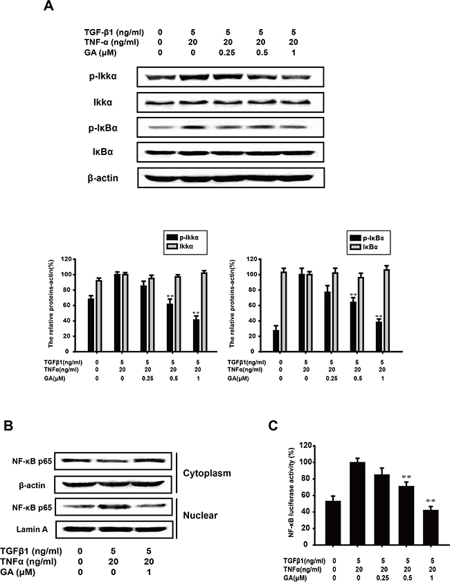 Figure 5: GA inhibits TGFβ1+TNFα-activated NF-κB signaling in A549 cells. (A) A549 cells were treated with the indicated concentrations of GA, TGFβ1, and TNFα for 24 h. Western blotting analyses of p-IKKα, IKKα, p-IκBα, and IκBα were performed with whole-cell lysates and specific antibodies. Anti-β-actin antibody was used to confirm equivalent protein loading. (B) Cytosolic fractions and nuclear extracts were prepared from cells treated with the indicated concentrations of GA, TGFβ1, and TNFα for 24 h. Western blotting analysis of NF-κB p65 was performed to investigate the nuclear translocation of NF-κB p65. (C) A549 cells were transiently transfected with an NF-κB reporter gene plasmid for 5 h. After transfection, the cells were washed and treated with the indicated concentrations of GA, TGFβ1, and TNFα for 24 h. The luciferase activities were detected as described in the Materials and methods. Each experiment was performed at least three times. *p < 0.05 compared with the TGFβ1+TNFα-treated group; **p < 0.01 compared with the TGFβ1+TNFα-treated group.