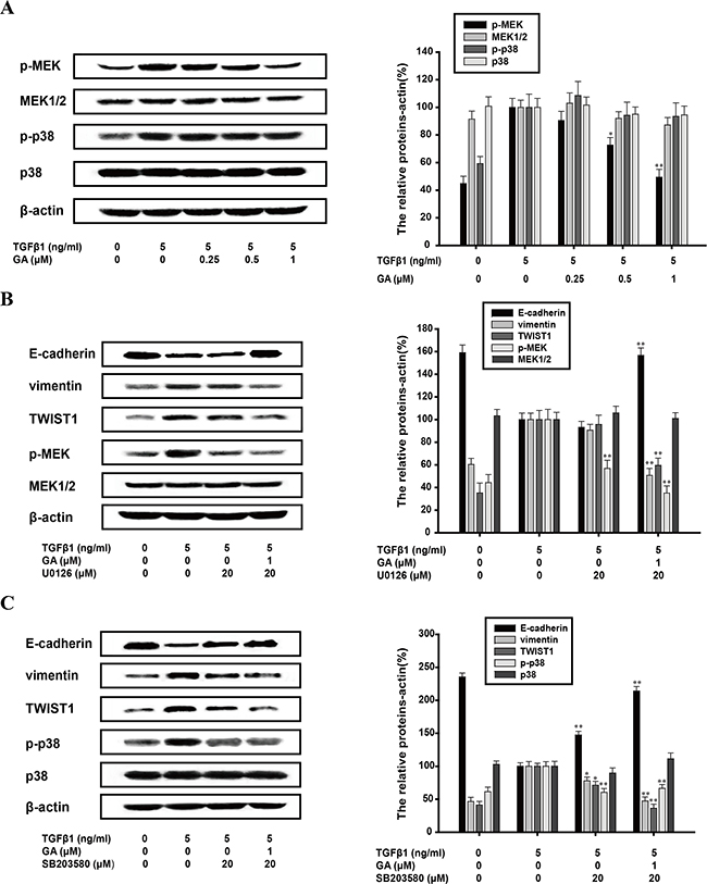 Figure 6: Inhibition of TGFβ1-induced EMT by GA does not require MAPK pathway. A549 cells were treated with the indicated concentrations of GA, TGFβ1, U0126 and SB203580 for 24 h. (A) Western blotting analyses of p-MEK, MEK1/2, p-p38 and p38 were performed with whole-cell lysates and specific antibodies. (B) Western blotting analyses of E-cadherin, vimentin, TWIST1, p-MEK and MEK1/2 were performed with whole-cell lysates and specific antibodies. (C) Western blotting analyses of E-cadherin, vimentin, TWIST1, p-p38 and p38 were performed with whole-cell lysates and specific antibodies. Anti-β-actin antibody was used to confirm equivalent protein loading. Each experiment was performed at least three times. *p < 0.05 compared with the TGFβ1-treated group; **p < 0.01 compared with the TGFβ1+TNFα-treated group.