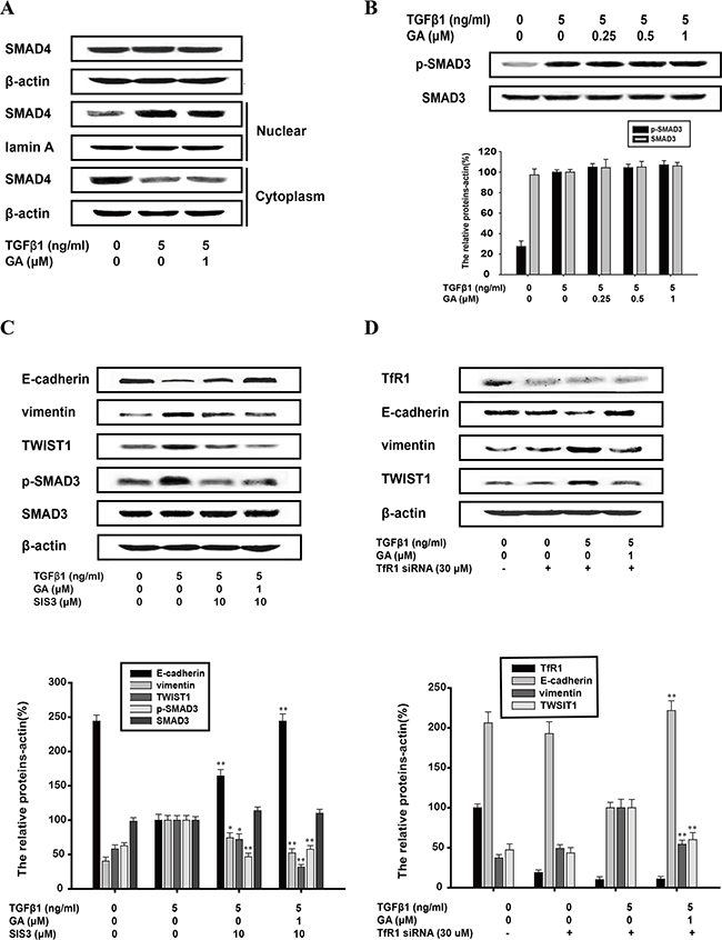 Figure 7: Inhibition of TGFβ1-induced EMT by GA does not require SMAD pathway or the transferrin receptor. A549 cells were treated with the indicated concentrations of GA, TGFβ1 and SIS3 for 24 h. (A) Cytosolic fractions and nuclear extracts were prepared. Western blotting analysis of total SMAD4 and the nuclear translocation of SMAD4 were performed with specific antibodies. (B) Western blotting analyses of p-SMAD3 and SMAD3 were performed with whole-cell lysates and specific antibodies. (C) Western blotting analyses of E-cadherin, vimentin, TWIST1, p-SMAD3 and SMAD3 were performed with whole-cell lysates and specific antibodies. (D) A549 cells were transfected with transferrin receptor siRNA and scrambled siRNA, and TfR mRNA level is used to measure transfection efficiency. When cells are transfected at efficiencies of 50–60%, western blotting analyses of transferrin receptor, E-cadherin, vimentin, TWIST1 were performed with whole-cell lysates and specific antibodies. Anti-β-actin antibody was used to confirm equivalent protein loading. Each experiment was performed at least three times. *p < 0.05 compared with the TGFβ1+TNFα-treated group; **p < 0.01 compared with the TGFβ1-treated group.