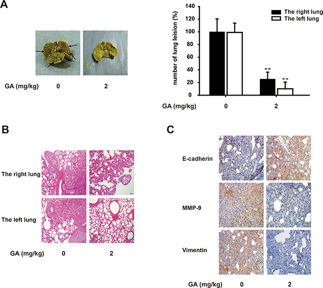 Figure 8: GA suppresses lung growth and metastasis of A549 cells in vivo. Murine lung orthotopic model of A549 cells was conducted to determine the effect of GA in vivo. (A) Macroscopic lung lesions were detected. After the lungs were fixed in Bouin’s solution, the numbers of lung metastatic nodules on the lung surfaces were quantified. (B) H&E stained bilateral lungs of mice from GA-treated and control group to confirm the malignance of nodules were and the presence of micrometastases. Each bar represents 100 μm. (C) Immunohistochemical detection of E-cadherin, MMP-9 and vimentin protein levels in the right lung (100×). Each experiment was performed at least three times. *p < 0.05 compared with the control; **p < 0.01 compared with the control.