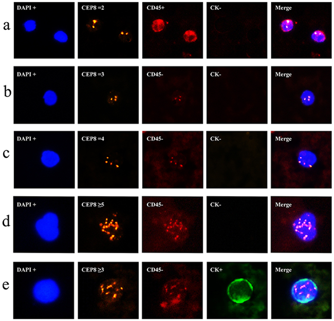 Figure 1: Identification of CTCs in colorectal cancer using the SE-iFISH platform. a. CK-/CD45+/DAPI+/CEP8=2 (WBC); b. CK-/CD45-/DAPI+/CEP8=3; c. CK-/CD45-/DAPI+/CEP8=4; d. CK-/CD45-/DAPI+/CEP8≥5; e. CK+/CD45-/DAPI+/CEP8≥3. DAPI, blue; CEP8, orange; CD45, red; CK, green; iFISH, immunostaining and fluorescence in situ hybridization; DAPI, (4’,6-diamidino-2-phenylindole); WBC, White blood cells; CEP8, Centromere Probe 8.