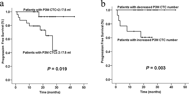 Figure 4: Kaplan-Meier curve analysis of PFS of colorectal cancer patients stratified by postoperative 3 months (P3M) CTC numbers. a. The average PFS in patients with P3M CTC< 2 was significantly better than those with P3M CTC≥2 (P= 0.019). b. The average PFS in patients with decreased P3M CTC number (compared with preoperative CTC number) was significantly better than those with increased P3M CTC number (P= 0.003).