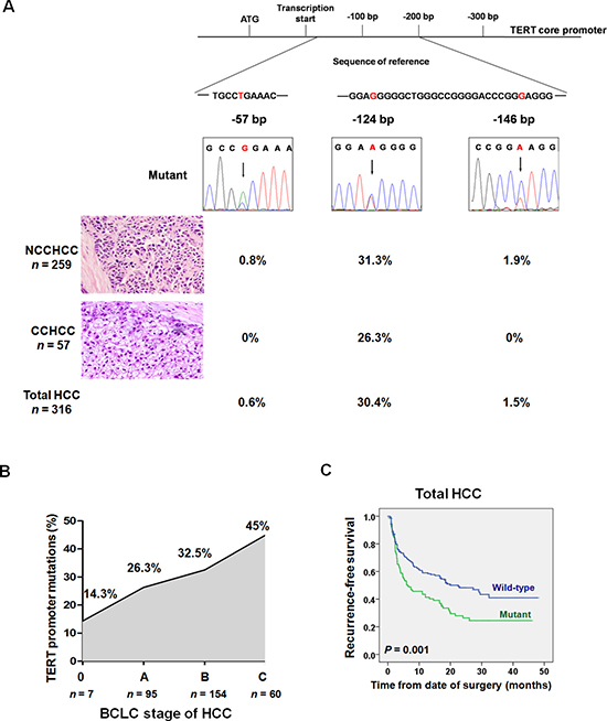 Figure 1: TERT promoter mutations in different subtypes of HCC and the prognostic value of mutations in predicting recurrence after resection. (A) Frequency of TERT promoter mutations in different subtypes of HCC. (B) TERT promoter mutations in the process of HCC progression according to BCLC staging. The frequency was stepwise increased during HCC progression (P = 0.038, χ2-test). (C) Kaplan-Meier plots of disease-free survival curves for patients with primary HCC stratified by TERT promoter mutation status (n = 275). Survival analysis was performed using the log-rank test. Abbreviations: BCLC, Barcelona Clinic Liver Cancer; CCHCC, clear cell hepatocellular carcinoma; NCCHCC, non-clear cell hepatocellular carcinoma.