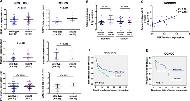 In order to verify the hypothesis that TERT promoter mutation was correlated with telomere-dependent activity in NCCHCCs, we quantified the telomerase activities in tumor tissues by TRAP (telomeric repeat amplification protocol) assay. The results in Figure 3B indicated that the telomere-dependent activity in NCCHCCs harboring mutations was significantly raised compared with that in wild-type cases (P = 0.022, Mann-Whitney test), whereas no significant difference of telomere-dependent activity was found between TERT wild-type and mutant in CCHCCs (P = 0.956, Mann-Whitney test). Pearson correlation analysis in Figure 3C indicated that telomerase activity correlated with TERT nuclear expression in NCCHCC patients (P < 0.001, r2 = 0.493). The results revealed that increased nuclear expression of TERT in NCCHCCs harboring TERT promoter mutations was accompanied by enhanced telomerase activity in nucleus. The Kaplan-Meier survival analysis indicated that TERT promoter mutations were associated with reduced recurrence-free survival of patients with both NCCHCCs (P = 0.011, Log-rank test, Figure 3D) and CCHCCs (P = 0.047, Log-rank test, Figure 3E).