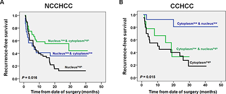 We compared the TERT nuclear and cytoplasmic expressions between different subgroups stratified by clinical characteristics in NCCHCCs and CCHCCs, respectively (Table 1). In NCCHCCs, higher expression level of nuclear TERT was significantly associated with multiple number of tumors (P = 0.002, Mann-Whitney test). Interestingly, higher expression level of cytoplasmic TERT was significantly associated with lower level of α-fetoprotein and tumor well-differentiation (P = 0.028 and P = 0.021, respectively, Mann-Whitney test, Table 1). The Kaplan-Meier survival analysis further demonstrated that NCCHCCs with low nuclear as well as high cytoplasmic expression tended to have a better recurrence-free survival, whereas NCCHCCs with high nuclear expression had the worst prognosis (P = 0.016, Log-rank test, Figure 5A). The results above indicated that cytoplasmic TERT correlated with early development of NCCHCCs, whereas nuclear TERT correlated with aggressive behavior and poor survival of NCCHCCs.