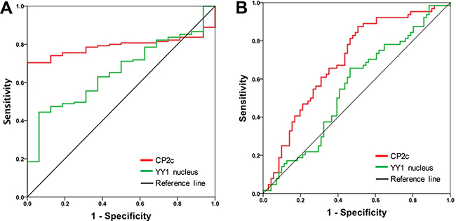 Figure 2: Receiver operating characteristic (ROC) curves of CP2c and nuclear YY1 expression as diagnostic markers for HCC. (A) ROC curves for CP2c and nuclear YY1 expression in normal liver versus HCC tissue samples. (B) ROC curves to determine the optimal cut-off values for CP2c and nuclear YY1 expression according to disease free-survival in 116 HCC patients.