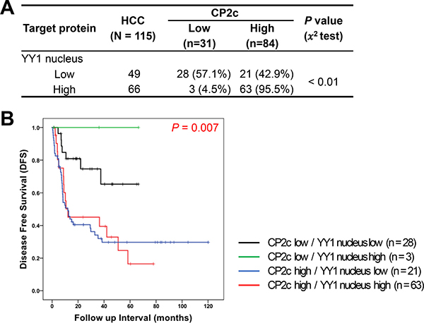 Figure 4: Prognostic significance of combined detection of high CP2c and nuclear YY1 expression in HCC patients. (A) Association between CP2c and nuclear YY1 expression in HCC. (B) Kaplan-Meier curves for disease-free survival of HCC patients according to the combination of CP2c and nuclear YY1 expression.