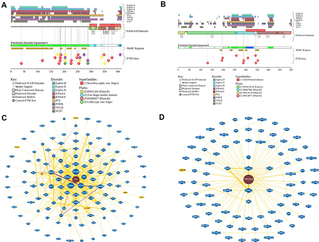 Figure 5: Functional disorder in YY1 and CP2c. (A and B) Evaluation of the functional intrinsic disorder propensity of human YY1 (UniProt ID: P25490, plot A) and CP2c (UniProt ID: Q12800, plot B) analyzed by the D2P2 database (http://d2p2.pro/) [53]. Top nine colored bars represent location of disordered regions predicted by different disorder predictors (Espritz-D, Espritz-N, Espritz-X, IUPred-L, IUPred-S, PV2, PrDOS, PONDR® VSL2b, and PONDR® VLXT, see keys for the corresponding color codes). Green-and-white bar in the middle of the plot shows the predicted disorder agreement between these nine predictors, with green parts corresponding to disordered regions by consensus. Yellow bar shows the location of the predicted disorder-based binding site (MoRF region), whereas differently colored circles at the bottom of the plots show locations of various posttranslational modifications. (C and D) Analysis of the interactivity of human YY1 (plot C) and CP2c (plot D) using the BioGRID database containing information on published protein interactions [54]. Yellow nodes denote interactors in different organism, whereas blue nodes indicate interactors in same organism.