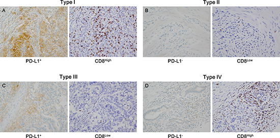 In this study, we classified a large cohort of stage II and III GC patients who were managed with standard treatment into one of four TMITs, using immunohistochemical assessment of PD-L1 expression and CD8+ TIL infiltration as the surrogate markers of the tumor microenvironment (TME). We found that TMIT I (PD-L1+/CD8High) is closely correlated with EBV infection and MSI-H phenotype than TMIT IV (PD-L1−/CD8High). Additionally, to validate our results, we analysed datasets from TCGA [19] and the SMC cohort, the latter of which is a mostly Asian population [17]. The results also showed that the EBV+ and MSI-H cases in the both datasets were likely to be type I (PD-L1High/CD8AHigh).