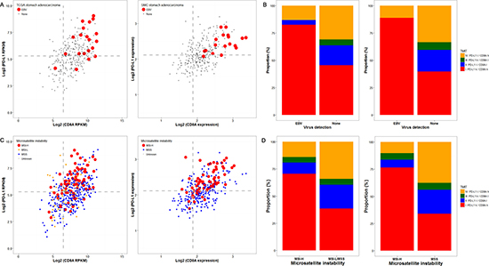 Figure 3: Genomic analysis of the cancer genome atlas (TCGA) and samsung medical center (SMC) cohort datasets according to Epstein-Barr virus (EBV) and microsatellite instability (MSI) status. The PD-L1/CD8A expression patterns according to EBV status in TCGA (left) and SMC (right) datasets are shown (A), and EBV-positivity (red dots) was associated with higher expression of both PD-L1 and CD8A. Concordantly, more than 75% of the cases in both datasets were tumor microenvironment immune type (TMIT) I (red box) (B). Similarly, MSI-H cases (red dots) were associated with higher PD-L1/CD8A expression (C) TCGA (left) and SMC (right)), and were thus TMIT I (red box) (D).