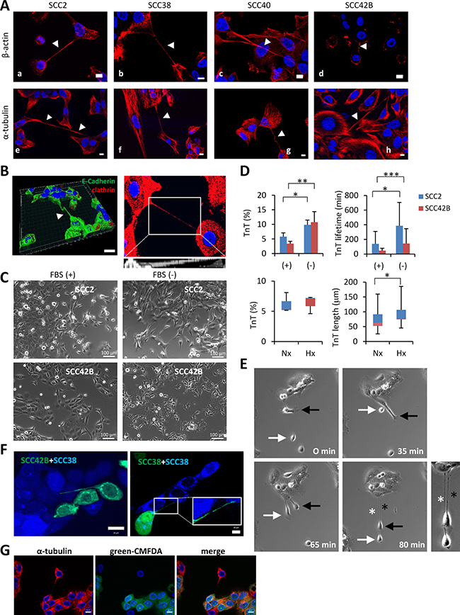Figure 1: Similarities of long cell projections in SCC-derived cells with TnTs. (A) Representative images of staining for β-actin and α-tubulin in the indicated cell lines (white arrows points to TnT projections). Image in c is a 76 μm Z-projection of 17 optical sections showing a TnT that crosses above the nuclei of an adjacent intermediate cell thus suggesting that TnTs are not attached to the culture plate surface but hover over it. Scale bars, 10 μm. (B) Left, three-dimensional reconstruction of Z-stacked images using Imaris software showing a TnT that hovers over the culture plate surface. Cells were immunostained with the indicated antibodies. The resulting image represents a stack of 9 sections (Z step of 2.8 μm) with a total physical length of 25.2 μm. Scale bar, 30 μm. Right, 17.3 μm Z-projection of 9 optical sections of SCC2 cells immunostained with β-catenin. The projection allows visualization of the whole length of the TnT which could not be visualized in a single z dimension. At the bottom is shown an xz projection of inset area, demonstrating that the TNT run above the surface of the substrate. (C) Representative images of the indicated SCC cells cultured in the presence (+) or absence (−) of FBS for 24 hours. Scale bars, 100 μm. (D) Up, quantification of percentages and lifetime of TnTs in cells treated as indicated in panel C. Down, quantification of percentages and length of TnTs in cell incubated under normoxic (21% O2, 24 h) or hypoxic (1% O2, 24 h) conditions. Cells were pictured by using a bright field microscope and an 8x8 tile was used for TnTs identification and counting. Data are presented as mean ± standard deviation from 2 individual experiments and 800 cells analyzed in each.* indicates P < 0.05, ** indicates P < 0.005, *** indicate P < 0.0005. (E) Representative images of SCC38 cells from time-lapse movies at the indicated time points. White and black arrows point to two different cells involved in the assembly of two TnT projections which are denoted by white and black asterisks, respectively. A magnified picture of the two TnTs formed at 80 min is shown at the right. (F) Fluorescence images of co-cultures of SCC42B cells, labeled with CellTracker green CMFDA, and SCC38 cells, labeled with CellTracker blue CMAC (left) or SCC38 cells independently labeled with either green CMFDA or blue CMAC (right). Inset (right picture) shows a magnified image of the TnT. (G) Immunofluorescence analysis of α-tubulin in co-culture of SCC38 cells labeled and not labeled with green CMFDA.