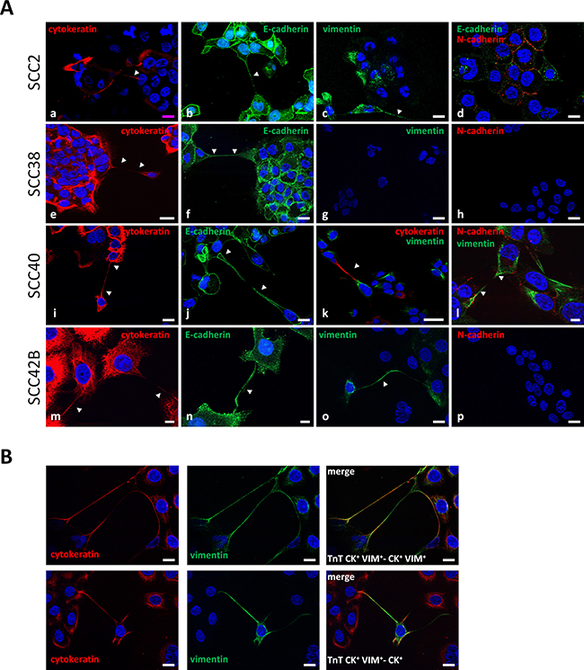 Figure 2: TnTs establish connections between mesenchymal and epithelial cancer cells. (A) Representative images of staining for cytokeratin, E-cadherin, vimentin, and N-cadherin in the indicated cell lines. The image of E-cadherin in SCC2 and SCC42B cells are a 2.8 μm and 17.3 μm Z-projection, respectively, of 9 optical sections which allows visualization of the whole length of a TnT hovering over the culture surface given that whole TnT could not be visualized in a single z dimension. Arrows indicate CK+-CK+ (a, e, i, m), E+-E+ (b, f, j, n), VIM+-VIM+ (c, l, o), and CK+-VIM+ (k) TnTs. Scale bars, 10 μm (l-n), 20 μm (a-j, o, p), 50 μm (k). (B) Representative images of co-staining for cytokeratin and vimentin of SCC42B cells showing CK+VIM+-TnTs connecting a CK+-cell or a CK+VIM+-cell as indicated. Scale bars 18 μm.