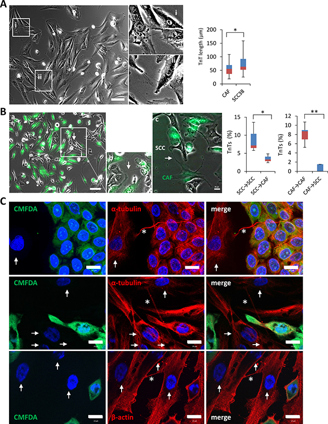 Figure 3: TnTs emanating from SCC cells preferentially connect with other cancer cells rather than to cancer-associated fibroblasts. (A) Phase contrast image of cancer associated fibroblasts. Insets at the right (i and ii) show magnified images to better visualize the presence of TnTs connecting fibroblasts. Cells were pictured by using a bright field microscope and an 8x8 tile was used for TnTs identification and counting. Graph shows quantification of TnT length in fibroblasts as compared to those of SCC38 cells. Data are presented as mean ± standard deviation from 2 individual experiments and 380 cells analyzed in each. * indicates P < 0.05. (B) Representative phase contrast plus green fluorescence image of CAFs, labeled with green CMFDA, and SCC cells co-culture. Inset (b) shows a magnified image to better visualize the TnTs connecting a SCC cell with a fibroblast. Image c shows a green TnT that emanates from a CAF and establishes contact with a SCC cell. Cells were pictured by using a bright field plus fluorescence microscope and an 8x8 tile was used for TnTs identification and counting. Graphs show quantification of the percentage of TnTs connecting SCC38-to-SCC38 cells (SCC38→SCC38), SCC38-to-CAFs (SCC38→CAF), CAF-to-CAF (CAF→CAF) or CAF-to-SCC38 cells (CAF→SCC38). Data are presented as mean ± standard deviation from 2 individual experiments and 570 cells analyzed in each. White arrows point to TnTs. * indicates P < 0.05, ** indicate P < 0.005. (C) Representative images of staining for β-actin and α-tubulin in co-cultures of CAFs and SCC38 cells. Adherent SCC38 cells were fluorescently labeled with CellTracker green CMFDA before the addition of un-labeled CAFs. Co-cultured cells were incubated at 37°C for 10–12 hours to allow for CAFs adhesion and TnT formation before immunofluorescence staining. Arrows and asterisks point to CAFs and TnTs, respectively.