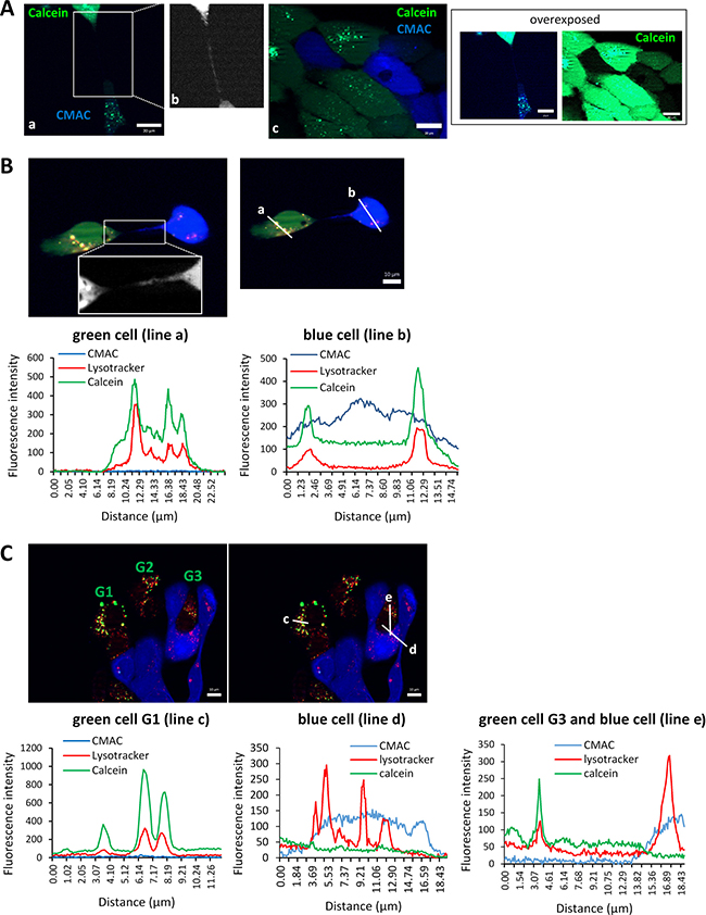 Figure 6: Traffic of calcein-AM-loaded lysosomes inside TnTs. (A) SCC38 cells labeled with CellTracker blue CMAC were mixed (1:1) with SCC38 cells loaded with 0.5 μM calcein AM (green) and incubated at 37°C for 48 h before analysis. Panel b shows a magnified image of the area indicated in panel a. This image was transformed to black and white pseudocolor and was over-exposed to better visualize the blue TnT. Panel c shows the absence of transfer of blue or green dyes between adjacent cells not connected by TnTs. Over-exposed pictures are shown in the right to highlight that granular calcein-AM staining is not found in blue cells adhered to adjacent green cell. Scale bars, 20 μm. (B, C) Representative images showing colocalization imaging studies of calcein-AM and lysotracker. SCC38 cells labeled with CellTracker blue CMAC were mixed (1:1) with SCC38 cells loaded with 0.5 μM calcein AM (green) and incubated at 37°C for 48 h. Co-cultures were subsequently labelled with lysotracker (red) before analysis. A magnified image of the area indicated in panel B is shown to better visualize the thin TnT. Graphics show the fluorescence intensity profiles of the ROIs (a-e) indicated in the pictures. Calcein-AM labelled cells in C are denoted as G1-G3. Note that graphic in the left show colocalization of red and green fluorescence in the G3 cell that do not emit blue fluorescence while this colocalization is not observed in the cell emitting blue fluorescence. Scale bars, 10 μm.