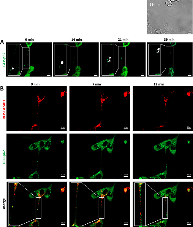 Figure 8: Traffic of autophagosomes, labeled with LAMP1 and p62, inside TnTs. Representative images from time-lapse movies at the indicated time points. SCC38 cells were transiently transfected with pMXs-puro GFP-p62 (A) or co-transfected with LAMP1-mRFP-FLAG and pMXs-puro GFP-p62 (B) constructs. Bright-field image at time 0 and 39 min is shown in the upper part of panel A to illustrate the presence of the TnT connecting the two cells. Scale bars, 10 μm.
