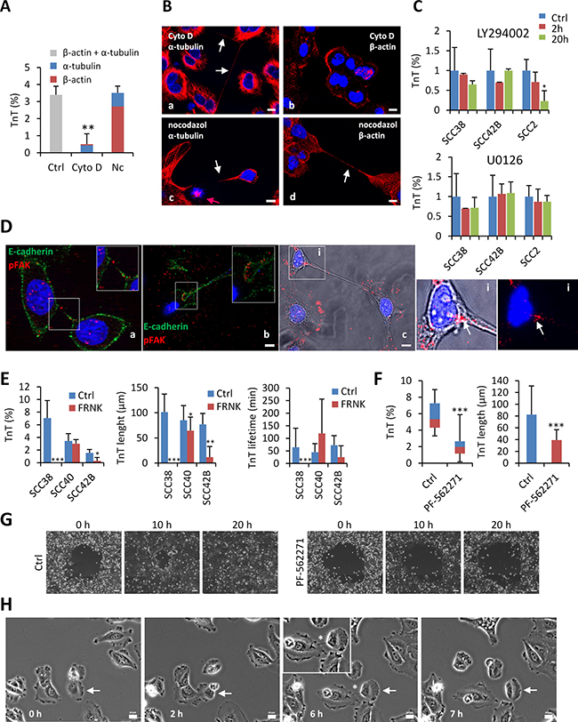 Figure 9: Involvement of actin microfilaments, PI3K and FAK in TnT formation. (A) Percentage of SCC38 cells containing TnTs upon treatment with solvent (Ctrl, 0.1% DMSO), cytochalasin D (Cyto D, 1 μM) or nocodazole (Nc, 1 μM) for 24 h. The percentages of TnTs that contains β-actin or α-tubulin after treatments were quantified by immunofluorescence staining with the corresponding antibodies. Values are mean ± standard deviation from two independent experiments (3246 cells counted). (B) Representative images of the β-actin and α-tubulin immunostainings in cells treated with cytochalasin D or nocodazol. White arrows indicate TnTs. Note that treatment with nocodazole efficiently induced cell cycle arrest (pink arrow in c) but did not inhibit TnT formation. Scale bars, 10 μm. (C) Quantification of the percentage of TnTs relative to the total number of cells. Cells were treated with solvent (0.1% DMSO), U0126 (5 μM), or LY294002 (25 μM) for the indicated times. Values are mean ± standard deviation from two independent experiments (1500-2000 cells counted in each). (D) Representative images of staining for E-cadherin and pY397 FAK (pFAK) (a,b) and pY397 FAK (c) in SCC42B cells. Insets show that pFAK immunostaining appears as small dots in some TnTs and as focal-adhesion-type linear structure in others. Image c is a color composite image of bright field and fluorescence. Panels i show magnified images (bright field and fluorescence on the left picture and only fluorescence on the right picture) of the indicated area. White arrows in (i) indicate pFAK staining of focal-adhesion-type linear structures at the edge of the TnT. Scale bar, 10 μm. (E) Quantification of the percentage of TnTs relative to the total number of cells, and the TnTs maximal length and lifetime in control (Ctrl) and FRNK-SCC cells (550 cells in each condition counted by using bright field microscopy) (F) Quantification of the percentage and the length of TnTs relative to the total number of cells in cells treated or not with PF-562271 (1 μM) for 24 h. Values are mean ± standard deviation from two independent experiments (1500-2000 cells counted in each). Measurements were performed using bright field microscopy. * indicates P < 0.05, ** indicates P < 0.005, *** indicates P < 0.0005. (G) Representative images of wound healing assay performed in SCC42B cells in the presence of 0.1% DMSO (Ctrl) or 1 μM PF-562271 at the indicated time points. Scale bars, 100 μm. (H) Representative images of FRNK-SCC40 cells from time-lapse movies at the indicated time points. White arrows point to a cell involved in the assembly of a TnT.