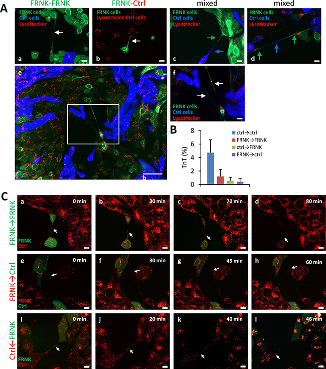 Figure 10: Traffic of endosomal/lysosomal vesicles through TnTs that connect FAK-proficient and FAK-deficient cells. (A) Representative images of FRNK- and Ctrl-cells co-cultures. FRNK-SCC38 and Ctrl-SCC38 cells were labeled with CellTracker green CMFDA and CellTracker blue CMAC dye, respectively (a, c, d). In panel b, Ctrl-cells were not labeled. Co-cultured cells were subsequently labeled with lysotracker (red). Image in (e) was taken by using a 3 × 3 tile. Stitching was performed with the Zen software. (f) Higher magnification of the area outlined in the image (e). White arrows denote FRNK-FRNK TnTs (a, f) and FRNK-Ctrl TnTs (b). Mixed, green and blue, TnTs are indicated by green and blue arrows (c, d). (B) Quantification of TnTs that emerge from Ctrl-cells and contact with Ctrl (Ctrl-Ctrl) or FRNK cells (Ctrl-FRNK) and TnTs that emerge from FRNK and contact with Ctrl (FRNK-Ctrl) or FRNK cells (FRNK-FRNK). Data are presented as mean ± standard deviation from 2 individual experiments and 2000 cells analyzed in each. Measurements were performed using fluorescence microscopy. (C) Representative images from time-lapse movies at the indicated time points. FRNK-SCC38 cells labeled with green CMFDA were co-cultured (1:1) with non-fluorescently labeled FRNK- (a-d) or Ctrl-SCC38 cells (i-l). (e-h) Ctrl-SCC38 cells labeled with green CMFDA were co-cultured (1:1) with non-fluorescently labeled FRNK-cells. Co-cultured cells were subsequently labeled with lysotracker (red). White arrows denote lysotracker-labeled vesicles traveling through TnTs that connect FRNK-FRNK cells (a-d) or FRNK-Ctrl cells (e-l). Note that the direction of movement along FRNK-Ctrl TnTs is from the FRNK to the Ctrl-cell irrespective of whether the TnT emerge from a FRNK (e-h) or from a Ctrl-cell (i-l). Scale bars, 10 μm.