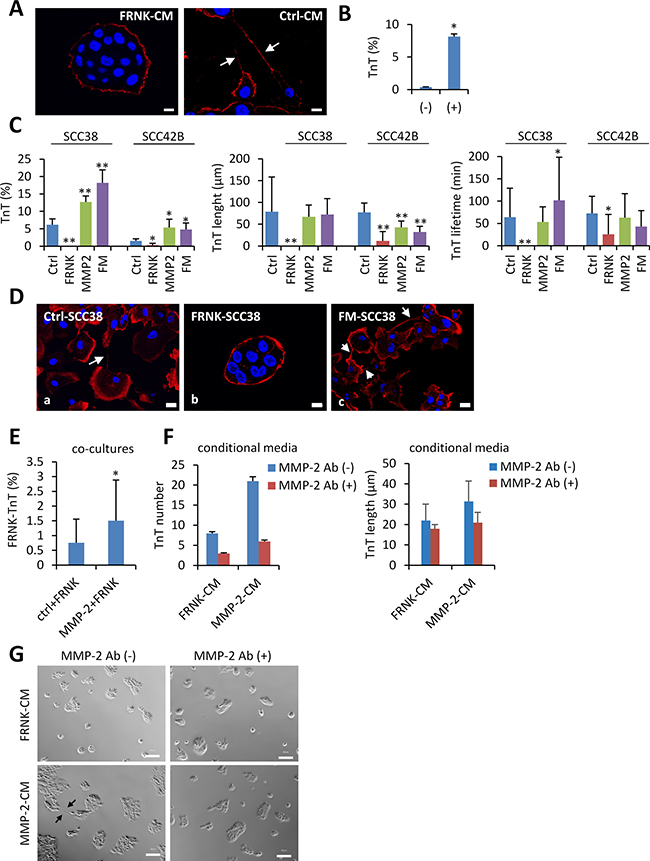 Figure 11: Rescue of TnT formation in FAK-deficient cells. (A) Representative images of staining for β-actin in FRNK-SCC38 cells incubated for 24 h with conditioned medium obtained from FRNK-SCC38 cells (FRNK-CM) or Ctrl-SCC38 cells (Ctrl-CM). The conditional media were collected after 48h of cell culture at 70% confluence. White arrows denote TnTs. (B) Quantification of TnTs in FRNK-SCC38 cells co-cultured with FRNK-CM (−) or Ctrl-CM (+). Data are presented as mean ± standard deviation from 3 individual experiments and 200-400 cells analyzed in each. Measurements were performed using fluorescence microscopy. (C) Quantification of the percentage of cells with TnTs, and the TnT-maximal length and lifetime in the indicated Ctrl, FRNK-, MMP-2- and FRNK-MMP2 (FM)-cells. Measurements were performed using bright field microscopy. Data are presented as mean ± standard deviation from 3 individual experiments and 2500-3000 cells analyzed in each. (D) Representative images of staining of β-actin in the indicated cell lines. Note that FRNK-SCC38 cells lack TnTs but these re-appear in FRNK cells upon MMP-2 over-expression (FM-SCC38). (E) Percentage of TnTs in FRNK-SCC38 cells when co-cultured with Ctrl-SCC38 cells (Ctrl+FRNK) or with MMP-2-SCC38 cells (MMP-2+FRNK). To distinguish different cell types, Ctrl- or MMP2-SCC38 cells were labelled with green CMFDA and FRNK-SCC38 cells were labelled with blue CMAC. Measurements were performed using fluorescence microscopy. Data are presented as mean ± standard deviation from 2 individual experiments and 2500-3000 cells analyzed in each. (F) TnT numbers in FRNK-SCC38 cells incubated for 24 h with conditional medium obtained from FRNK-SCC38 cells (FRNK-CM) or MMP-2-SCC38 cells (MMP-2-CM) in the presence (+) or absence (−) of blocking MMP-2 antibody. The conditional media were collected after 48h of cell culture at 70% confluence. TnT counting was performed using bright field microscopy. Data are presented as mean ± standard deviation from 2 individual experiments and 20000 cells analyzed in each. (G) Phase contrast representative micrographs of FRNK-SCC38 cells incubated with the indicated conditional media in the presence or absence of MMP-2 antibody. Scale bars, 10 μm. * indicates P < 0.05, ** indicate P < 0.005.
