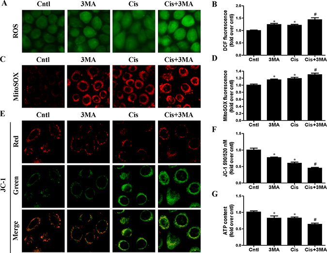Figure 4: Effect of autophagy inhibitor on cisplatin-induced mitochondrial dysfunction. HK2 cells were pre-treated with 3MA (5 mM) for 1 h, then incubated with cisplatin (10 uM) for further 12 h. (A) Representative images of HK2 cells stained with DCFDA (×200). (B) The DCF fluorescence intensities were analyzed by fluorescence microplate reader. (C) Representative images of HK2 cells stained with MitoSOX (×200). (D) Quantitation of MitoSOX by flow cytometry. (E) Representative images of HK2 cells stained with JC-1 (×200). (F) Mitochondrial membrane potential was detected by fluorescence microplate reader. (G) ATP contents were detected as described in Materials and Methods. Data are expressed as the means ± SEM (n = 6). *P < 0.01 versus control. #P < 0.01 versus cisplatin treatment group. Cntl, control group, Cis, cisplatin group, Cis+3MA, cisplatin+3MA group.