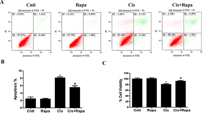 Figure 6: Effect of autophagy inducer on cisplatin-induced HK2 cells injury. HK2 cells were pre-treated with rapamycin (100 nM) for 1 h, and then incubated with cisplatin (10 uM) for further 12 h. (A) The effects of rapamycin on cisplatin-induced apoptosis were determined by flow cytometry. (B) Quantitation analysis of apoptosis. (C) Cell viability was determined by CCK-8 assay. Data are expressed as the means ± SEM (n = 6). *P < 0.01 versus control. #P < 0.01 versus cisplatin treatment group. Cntl, control group, Rapa, rapamycin group. Cis, cisplatin group, Cis+ Rapa, cisplatin+rapamycin group.