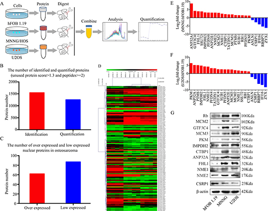 Figure 1: Experimental workflow for the SWATH™ quantitative proteomics analysis. (A) Flowchart of the proteomic analysis. (B) Numbers of identified and quantified nuclear proteins in the SWATH™ analysis. (C) Numbers of upregulated and downregulated nuclear proteins in osteosarcoma cells. (D) A heat map of dysregulated proteins in osteosarcoma. (E, F) The mRNA expression levels of 18 upregulated and 5 downregulated nuclear proteins in MNNG/HOS and U2OS cells compared with hFOB 1.19 cells were verified by qRT-PCR. (G) Representative blots display the protein expression levels of 11 upregulated and one downregulated nuclear proteins. β-actin was used as an internal control.