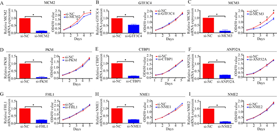 To determine osteosarcoma proliferation-related nuclear proteins, functional screening by siRNA knockdown and CCK-8 assay [17] were performed. We chose 9 nuclear proteins, namely, MCM2, GTF3C4, MCM3, PKM, CTBP1, ANP32A, FHL1, NME1, and NME2, which might be associated with osteosarcoma oncogenesis. The results showed that the inhibition of MCM2 or MCM3 could restrain the proliferation of osteosarcoma cells, whereas the inhibition the other proteins had no effect on the proliferation of osteosarcoma cells (Figure 2). In sum, we hypothesized that MCM2 and MCM3 were associated with the proliferation of osteosarcoma cells.
