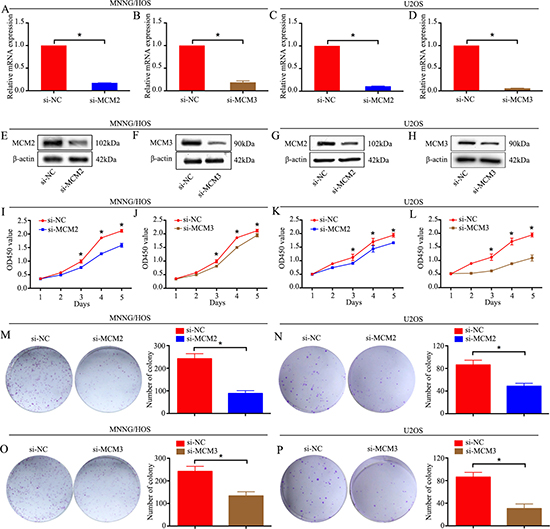 Figure 3:Knockdown of MCM2 or MCM3 inhibits osteosarcoma cell proliferation in vitro. (A–H) The mRNA and protein expression levels were validated after MCM2-specific or MCM3-specific siRNA transfection by qRT-PCR and western blotting in MNNG/HOS cells and U2OS cells. (I–L) CCK-8 assays were performed after siRNA transfection in MNNG/HOS cells and U2OS cells. (M–P) Colony formation assay for MCM2-silenced or MCM3-silenced osteosarcoma cells and control cells. Data are representative of results from three independent experiments. *P < 0.05.