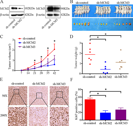 Figure 4: Knockdown of MCM2 or MCM3 inhibits osteosarcoma cell growth in vivo. (A) Representative blots display the protein expression of MCM2 and MCM3 in MNNG/HOS cells stably expressing sh-MCM2 or sh-MCM3. β-actin was used as an internal control. (B) The upper photograph shows tumor-bearing mice and the lower photograph shows tumors when mice were euthanized. (C) Growth curve drawn by measuring tumor volumes on the indicated days. (D) The diagram shows tumor weights in the sh-control, sh-MCM2, and sh-MCM3 groups. (E, F) Representative images of ki-67 staining in the sh-control, sh-MCM2, and sh-MCM3 groups. Magnification, ×50, ×200. *P < 0.05.