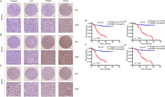 Figure 7: Clinical significance of MCM2 and MCM3 in osteosarcoma patients. (A–C) Representative IHC images of the expression levels (negative: score = 0, low: score = 1, middle: score = 2, and strong: score = 3) of MCM2, MCM3, and DHX9 in osteosarcoma tissues. Original magnification: 50×, 200×. (D–G) The impact of MCM2 and MCM3 on TFS and OS for patients with osteosarcoma.