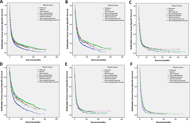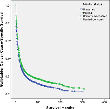 To our best knowledge, this is the first report studying the effect of marital status on the survival of GBC patients treated with surgical resection. Despite these potential limitations, our study confirmed that unmarried patients are at greater risk for cancer-specific mortality. Furthermore, we showed that widowed patients were always at the highest risk for death via cancer. Psychosocial factors may be the primary reasons leading to poor survival in unmarried patients. Therefore, to improve postoperative survival, physicians should take into consideration social supports during their care of unmarried patients with GBC and especially of widowed patients. Further clinical trials should be performed to confirm our hypothesis.