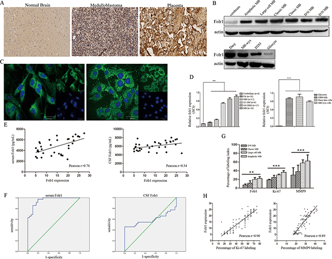 Figure 1: Folr1 expression in MB tissues and cells. (A) Representative IHC images of Folr1 expression in cerebrum, human MB tumor specimens and placentas in low-magnifying fields (100 ×). (B) Immunoblotting analysis of the Folr1 levels in human MB specimens (up) and tumor cells (down). (C) Representative confocal images of Folr1 expression in Daoy cells (left) and MB-wyx cells (right). (D) The relative mRNA levels of folr1 in different tissues (left) and cells (right). Bars are mean ± SD from at least three independent experiments. ***P < 0.001. (E) Statistical graph of correlation between Folr1 expression and serum (left) or CSF (right) Folr1 by Pearson analysis. (F) ROC curve of serum (left) and CSF (right) Folr1 for evaluating the biomarker significance for MB patients. (G) Statistical graph of Folr1, Ki-67 and MMP9 staining detected by IHC in four subtypes of MB. (H) Positive correlation between Folr1 expression and Ki-67 (left) or MMP9 (right) labeling was shown by Pearson analysis.