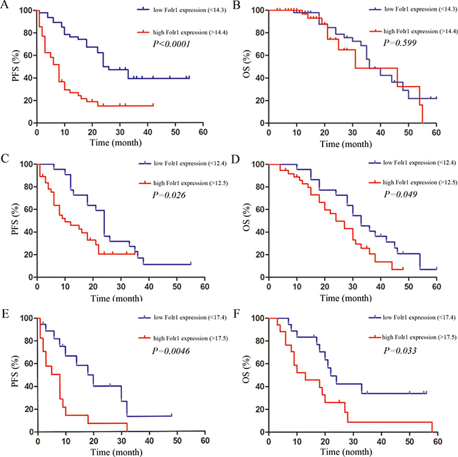 Figure 2: The association between prognosis and Folr1 expression in MB patients. (A–B) The PFS (A) and OS (B) in all the MB patients with the average Folr1 expression defined as the value of 14.3. (C–D) The PFS (C) and OS (D) in the average-risk group with the average Folr1 expression defined as the value of 12.4. (E–F) The PFS (E) and OS (F) in the high-risk group with the average Folr1 expression defined as the value of 17.4. Patients with Folr1 levels higher or lower than average expression are considered as high or low, respectively.