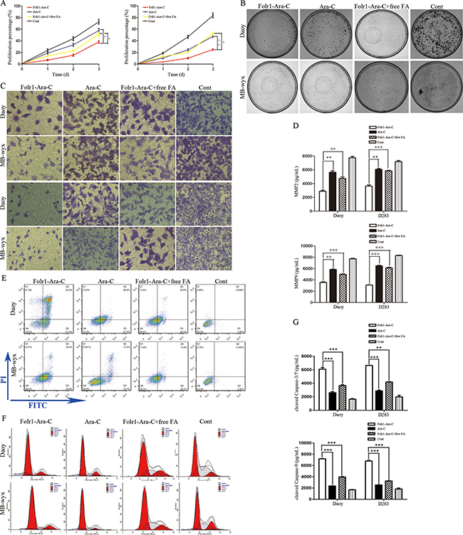 Figure 3: Effects of Folr1-Ara-C on on the proliferation, mobility and apoptosis of MB cells. (A) Daoy (left) and MB-wyx (right) cells were treated with the indicated concentration of Folr-Ara-C, Ara-C, Folr1-Ara-C+free FA and control for 8 h, respectively. Then cell proliferation was measured by MTS assay. (B) Colony formation assay of Daoy (up) and MB-wyx (down) cells was performed in the presence of Folr-Ara-C, Ara-C, Folr1-Ara-C+free FA and control for 8 h and cells were stained with 0.1% crystal violet. (C) Cell migration (up) and invasion (down) were evaluated by the transwell chamber assay without or within the membrane coated with Matrigel. (D) Secretion of MMP2 (up) and MMP9 (down) after 8 h of incubation with the indicated agents was analyzed by ELISA. (E) Representative images of cell apoptosis by FCM assay were shown. (F) Impacts of Folr1-Ara-C on Daoy (up) and D283 (down) cell cycle was analyzed by measuring the PI binding activity. (G) Cell apoptosis was evaluated by the cleaved Caspase-3/7 (up) and -9 (down) activity, respectively. Bars are mean ± SD from at least three independent experiments. *P < 0.05, **P < 0.01, ***P < 0.001.