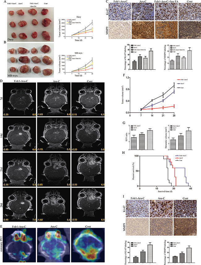 Figure 5: Application of Folr1-Ara-C on subcutaneous and intracranial xenografts derived from MB cells. (A–B) Daoy (up) and MB-wyx (down) cells were subcutaneously transplanted into nude mice respectively and representative images were shown as the targeted therapeutic effects of Folr1-Ara-C. (C) Representative staining panels of Ki-67 and MMP9 labeling in subcutaneous xenograft specimens in low-magnifying fields (100 ×). Then, percentage of Ki-67 (left) and MMP9 (right) staining was analyzed and positive cells with both markers in Folr1-Ara-C group were lower than others (P < 0.01). (D) MB-wyx cells were intracranially transplanted into nude mice, and microMRI scans on every week showed that Folr1-Ara-C markedly suppressed tumor growth. (E) PET/CT on 28th day showed that Folr1-Ara-C dramatically attenuated the metastasis. (F) Tumor volume curve showed that the xenograft in Folr1-Ara-C group progressed slowly. (G) SUV ratio (hypermetabolism center / natural background) and metastatic volume based on the PET/CT were shown and difference was significant (P < 0.01). (H) Kaplan-Meier curve for illustrating of the survival periods of the xenograft-bearing mice. (I) Representative images of Ki-67 and MMP9 expression in intracranial xenograft specimens in low-magnifying fields (100 ×). Percentage of Ki-67 (left) and MMP9 (right) staining was analyzed and there existed significant difference (P < 0.0001).