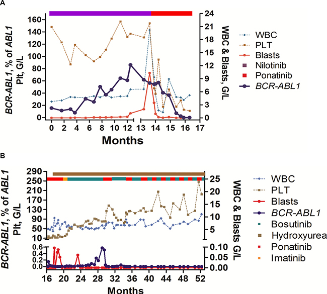 A 78-year-old female patient with multi-resistant Ph+ CML was referred because of blast crisis in July 2013. She had first been diagnosed with CML in 2001 in another hospital. Initially, she had received interferon-alpha and cytarabine, and later, from May 2002, imatinib at 400 mg daily. However, after an initial response, resistance against imatinib developed, and she was referred to our center in 2005. At that time accelerated CML was diagnosed and she received a combination of rapamycin and hydroxyurea (HU). However, despite cytoreduction, no major molecular response was obtained. Subsequently, she received dasatinib (2 × 70 mg/day) and entered a complete cytogenetic response (CCyR). However, in 2007, she developed pleural effusion, and after the dose of dasatinib was reduced to 100 mg/day, a dasatinib-resistant sub-clone bearing the BCR-ABL1 mutation F317L emerged. Treatment with nilotinib (2 × 400 mg/day) was introduced. In response to nilotinib, the patient entered a second CCyR, and BCR-ABL1 mRNA levels decreased to < 0.1% (of ABL1) in September 2008. However, in December 2009, BCR-ABL1 mRNA levels increased to 0.5%. Subsequently, the BCR-ABL1 mutation L248V was detected. During the next few months, BCR-ABL1 slowly increased further. However, because of stable blood counts and lack of alternative therapy options, she was maintained on nilotinib. In January 2011, a BM investigation revealed marked fibrosis without an increase in blast cells. Later in 2011, the patient developed transfusion-dependent anemia and thrombocytopenia (Table 1). In addition, BCR-ABL1 increased to 30%, and both L248V and a new BCR-ABL1 mutation, K274del, were detected. In June 2012, the patient developed an overt blast crisis. Treatment with ponatinib on a compassionate use program was initiated.