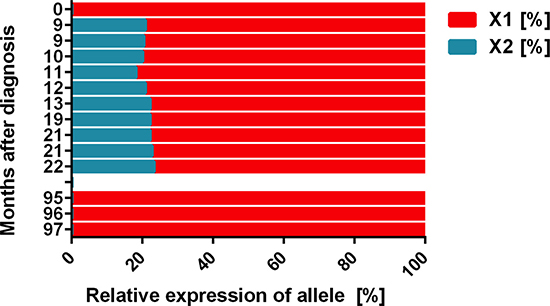 HUMARA analysis was performed using peripheral blood mononuclear cells (MNC) obtained at various time points before and during TKI therapy, following published techniques [41]. In brief, DNA was isolated from MNC using the MagNA Pure LC DNA isolation system (Roche) according to the manufacturer’s recommendations. The X-chromosome inactivation (XCI) pattern was determined by PCR analysis of the polymorphic CAG-repeat region in the HUMARA gene which is located next to an HpaII restriction site. Genomic DNA (~250 ng) was digested with HpaII for 19 hours at 37°C. Then, aliquots of undigested and HpaII-digested DNA were subjected to PCR using published primer sequences [41]. Amplicons were analyzed on an Applied Biosystems (ABI) 3130xl genetic analyser (Foster City, CA, USA) using the Gene Scan 3.7 (ABI) software. For quantification, the areas under the peaks of the two alleles from the undigested and digested DNA were determined and the ratio of the peak area of both alleles (X1, X2) was calculated (in summary 100%). The degree of X-chromosome inactivation is presented as percent of the smaller peak (X2) in relation to the larger peak (X1). Undigested female DNA usually shows 2 peaks of similar height (in 90% of females).