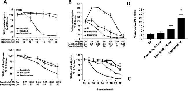 Figure 3: Drug combination effects in CML cells. (A) KU812 cells (upper panel) and K562 cells (lower panel) were incubated in control medium (Co), with various concentrations of ponatinib or bosutinib, or with a combination of both drugs at a fixed ratio (KU812 at 1:16; K562 at 1:100) at 37°C for 48 hours. Thereafter, 3H-thymidine was added for 16 hours, and uptake of 3H-thymidine was measured in a β-counter. Results are expressed as percent of medium control and represent the mean ± S.D. of quadruplicates. In case of KU812 cells, the drug combination was found to be highly synergistic, whereas in K562 cells, mostly additive effects were obtained. (B) Primary patient-derived blast cells were incubated in control medium (Co) or with increasing concentrations of hydroxyurea (HU), ponatinib, or bosutinib at 37°C and 5% CO2 for 48 hours as indicated. Then, 3H-thymidine uptake was measured. Results are expressed as percent of control and represent the mean ± S.D. of triplicates. (C) KU812 cells were incubated with ponatinib (0.1 nM: ■-■, 0.5 nM: ▲−▲, 1.0 nM: ▼-▼, or control medium: ●-●) at 37°C for 4 hours. Then, cells were washed and incubated in control medium (Co) or bosutinib at various concentrations as indicated for another 48 hours. Thereafter, 3H-thymidine uptake was measured. Results are expressed as percent of control and represent the mean ± S.D. of triplicates. (D) KU812 cells were incubated in control medium (Co), ponatinib (0.2 nM), bosutinib (10 nM), or a combination of both drugs at 37°C for 48 hours. Thereafter, the percentage of AnnexinV/PI-positive cells was determined by flow cytometry. Results represent the mean ± S.D. of 3 independent experiments. Asterisk (*): p < 0.05 compared to control.