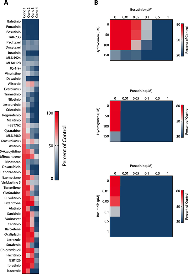Figure 4: High capacity drug testing using patient-derived CML blast crisis cells. (A) Nanoliter amounts of BCR-ABL1 TKI and other drugs were pre-seeded at 4 defined concentrations into 384-well microtiter plates using acoustic compound transfer. CML cells (10,000 per well) were automatically plated and incubated with drugs at 37°C for 72 hours. Thereafter, cell viability was determined using Cell-Titer Glo assay. Responses were determined by measuring the percentage of viable cell (relative to control) at the 4 drug concentrations applied. (B) Cells were exposed to the drug combinations ´bosutinib+hydroxyurea´ (upper panel), ´ponatinib+hydroxyurea´ (middle panel), and ´ponatinib+bosutinib´ (lower panel) in the robotic drug testing assay.