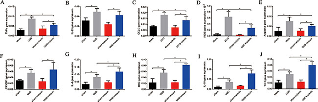 Figure 2: Relaxin shifts macrophage polarization toward the M2 phenotype in vivo following UUO. (A–J) Gene expression analysis of M1 markers, including tumor necrosis factor-α (TNF-α), interleukin (IL)-23, chemokine (C-C motif) ligand 3 (CCL3), inducible nitric oxide synthase (iNOS), and M2 markers, including arginase, CX3CR1, IL-4, mannose receptor (MRC), IL-10, Ym1 on macrophages isolated from kidneys of the mice pretreated with deionized water or relaxin following UUO. Experiments were performed at least three times and gene expression data were normalized to GADPH, analyzed, and represented as mean ± sd; n = 8 per group; *p < 0.05.