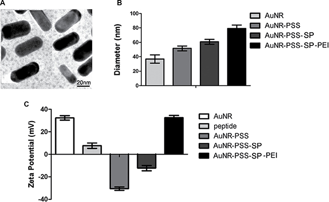 Among numerous nanomaterials, AuNRs possess tunable particle size, unique optical properties and incomparable biocompatibility, which have been considered as the promising drug delivery system in biomedical field, especially cancer diagnosis and therapy. During the last decade, the study on AuNRs in biomedical applications exhibits a tremendous increase, with well-developed methods to control the structure as well as their size. In our current study, AuNRs were made by two-step seed-mediated growth method adapted from previously established procedures [24, 25]. By transmission electron microscopy, we found that the AuNRs appeared uniform in particle size and were also in highly dispersible spherical shape in ultrapure water (Figure 3A). Hydrodynamic size distribution of the AuNRs was then analyzed by dynamic light scattering (DLS) technique (Figure 3B). The bared AuNRs displayed a size of 38 ± 2.3 nm. The particle size had been changed among different AuNRs nanocomplex. During the typical synthesis, CTAB was used as surfactant, which could form AuNRs wall around the micelles of the surfactant, and give the AuNRs positive charge (+33.5 mV) (Figure 3C). To load the peptides which have positive charge (+9.1 mV), the negative polymer PSS was functionalized into AuNRs, which exhibited negative charge (–31.8 mV). As shown in Figure 3C, the zeta potential of AuNRs-stable peptide remained the negative charge (–13.3 mV). Due to the negative charge on the cell membrane, the positive polymer PEI was utilized to change the charge of the AuNRs-SP-PEI nanocomplex (+ 32.1 mV), which showed strong electrostatic interaction with plasma membrane of the cells in our following experiments.
