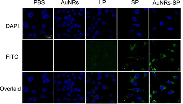 Figure 4: Fluorescent images of human BMSCs. Human BMSCs were treated with PBS (as blank), AuNRs, linear peptide (LP), stable peptide (SP) and AuNRs-SP for 4 hours. Peptides are modified with FITC and the signals from peptide-FITC in cells are assigned in green. DAPI is used to label nuclear DNA and are assigned in blue. Scale bars: 20 μm.