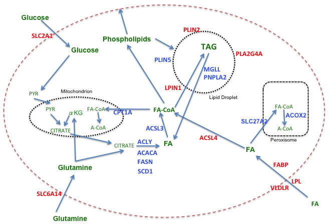 Figure 1: Fatty acid metabolism in breast cancer. Color code: Red = genes more highly expressed in TNBC versus RPBC; Blue = genes more highly expressed in RPBC versus TNBC; Green = metabolic substrates. Abbreviations: ACACA: acetyl-CoA carboxylase alpha; ACLY: ATP citrate lyase; ACOX2: acyl-CoA oxidase 2, branched chain; ACSL: long chain fatty acyl-CoA synthetase; CPT1A: carnitine palmitoyltransferase 1A; FABP: fatty acid binding protein; FASN: fatty acid synthase; LPIN1: lipin 1 (also known as phosphatidic acid phosphohydralase (PAP); LPL: lipoprotein lipase; MGLL: monoglyceride lipase; PLA2G4A: phospholipase A2, group IVA (also known as cytosolic phospholipase A2 (cPLA2);PLIN: perilipin; PNPLA2: palatin-like phospholipase domain containing 2 (also known as ATGL, adipocyte triglycderide lipase); SCD1: stearoyl-CoA desaturase 1; SLC2A1: Solute carrier family 2 member 1 (also know as GLUT1, glucose transporter 1); SLC6A14: solute carrier family 6 (amino acid transporter) member 14; SLC27A2: solute carrier family 27 member 2 (also known as ACSVL1, very long chain fatty acyl-CoA synthetase 1), FA: fatty acid; PYR: pyruvate; αKG: alpha ketoglutarate; A-CoA: acetylCoA; FA-CoA: fatty acyl-CoA.