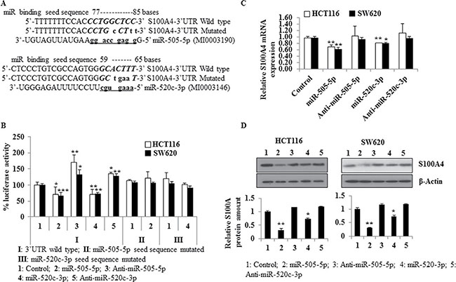 Figure 1: miR-505-5p and miR-520c-3p target the S100A4-3′UTR, and downregulate S100A4 expression. (A) The seed sequences for miR-505-5p and miR-520c-3p in S100A4-3′-UTR (wild type) were detected by in silico predictions. The wild type and mutated seed sequence were cloned into the dual-luciferase vector and luciferase assays were performed to show direct regulation of the S100A4-3′-UTR by these miRs. (B) Luciferase reporter assays of HCT116 and SW620 cells transfected with control-miR (Control), miR-505-5p, anti-miR-505-5p, miR-520c-3p, anti-miR-520c-3p and co-transfected with either S100A4-3′-UTR wild type or the mutated constructs were performed. Renilla luciferase values of the vector were used for normalization. Percent luciferase activity was calculated based on the control values. (C) S100A4 mRNA expression was quantified using qRT-PCR and RPII was used as internal control. (D) S100A4 Western blotting was performed and bands were densitometrically quantified by normalizing to the internal control β-actin. Mean values of triplicates were represented. (*p < 0.05; **p < 0.01).