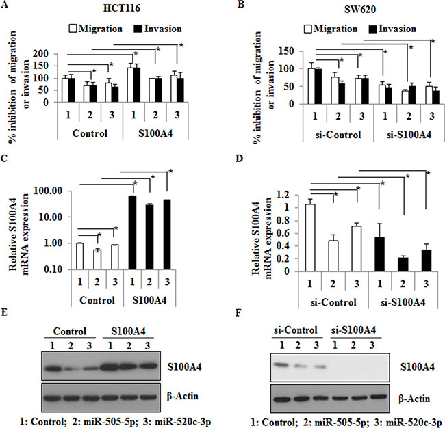 Figure 2: miR-505-5p and miR-520c-3p inhibit the S100A4 mediated migration and invasion in vitro. (A) HCT116 cells were co-transfected with control-miR, miR-505-5p and miR-520c-3p along with either vector-control or -S100A4, respectively. After 48 h cells were plated on top of the Boyden chambers for migration and matrigel-coated Boyden chambers for invasion. After 16 h the migrated or invaded cells were measured as described in the materials and methods. (B) SW620 cells were co-transfected with control-miR, miR-505-5p and miR-520c-3p along with either si-RNA-control (si-control) or si-RNA-S100A4 (si-S100A4), respectively. After 48 h the cells were used for migration and invasion assay as stated above. (C, D) Transfection efficiency of ectopic overexpression and knock-down of S100A4 on mRNA level was analyzed using qRT-PCR. (E, F) S100A4 protein expression after transfection was analyzed by Western blots. RPII was used as internal control for S100A4 mRNA expression and β-actin for Western blotting. (*p < 0.05).