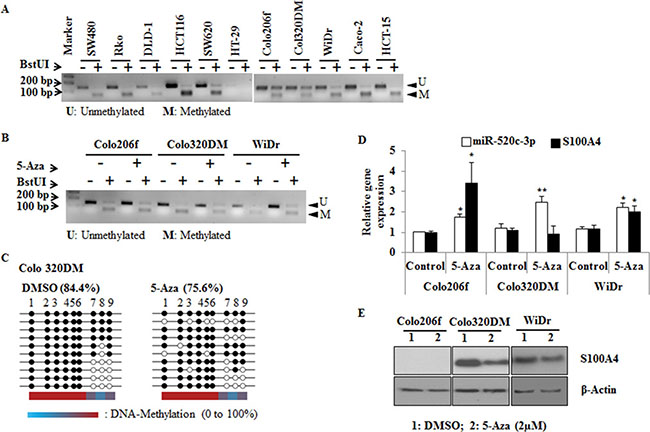 Figure 4: COBRA and bisulfite sequencing analysis of miR-520c regulatory region. (A, B) COBRA analysis using the restriction enzyme BstUI was performed to estimate the methylation status of miR-520c-3p in CRC cell lines. Colo206f, Colo320DM and WiDr were also analyzed after 5-Aza (2 μm) treatment for 3 days. (C) Colo320DM cells were treated with 2 μM 5-Aza for 3 days and the methylation of miR-520c-3p was analyzed by bisulfite sequencing. From each group 10 representative clones were sequenced. Each circle represents CpG islands in the sequenced region, and the black circle represents the methylated and the empty white circle represents unmethylated CpG island. (D, E) qRT-PCR of miR-520c-3p, S100A4 and Western blot analysis of S100A4 were performed after 5-Aza treatment of Colo206f, Colo320DM for 3 days (20 μg of total protein used for Western blot) and WiDr (5 μg of total protein used for Western blot) cell lines (from low to moderate S100A4 expressing cells). RNUB6, RPII and β-actin served as internal controls. (*p < 0.05; **p < 0.01).