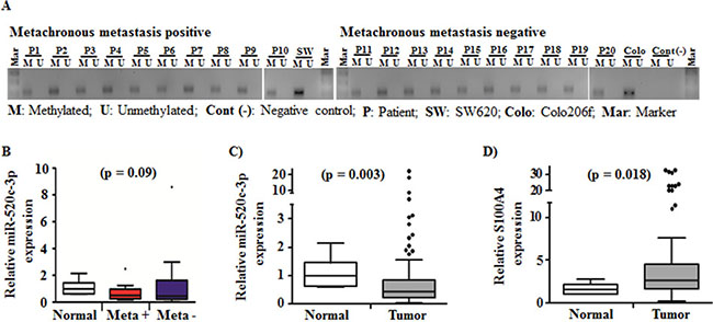 Figure 5: Methylation status of the miR-520c regulatory region and expression of miR-520c-3p and its target S100A4 in a cohort of CRC tumor specimens. (A) Methylation specific PCR products of metachronous metastasis positive and metachronous negative CRC tumor specimens were analyzed using agarose gel electrophoresis. The miR-520c regulatory element was methylated in all specimens. The two cell lines SW620 and Colo206f served as internal controls. (B) miR-520c-3p expression in metachronous metastasis positive (n = 10) and negative (n = 10) CRC tumor specimens in comparison to representative normal mucosa were quantified using qRT-PCR. (C, D) miR-520c-3p and S100A4 expression in CRC tumor specimens in comparison to representative normal mucosa were quantified using qRT-PCR. RPII and RNUB6 served as internal controls.