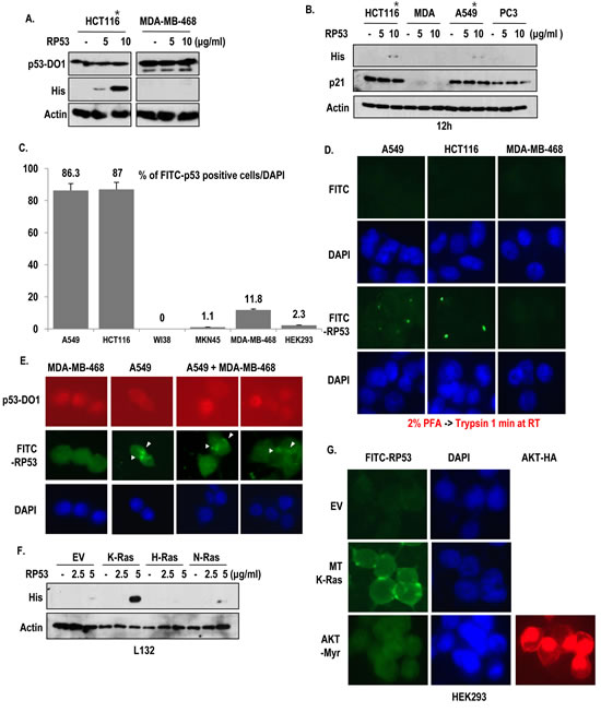 Figure 1: Specific uptake of RP53 by K-Ras mutant cell lines. (A) Endocytosis of Recombinant p53 (RP53) occurred in mutant type K-Ras containing cancer cell lines (*) without alteration of endogenous p53 expression. RP53 was treated in HCT116 and MDA-MB-468 cells with indicating dosage. Cells were incubated with RP53 for 2 h. RP53 and endogenous p53 were detected using His antibody and DO-1, respectively. Actin was used as a loading control. (B) Selective endocytosis of RP53 in K-Ras mutated cells. Among 4 kinds of cells, K-Ras mutated cells (*) uptake RP53. Moreover, p21, target gene of p53, was not altered by RP53 treatment. (C) Cell counting of FITC-RP53 positive cells. To know how many cells could uptake RP53, we counted FITC positive cells from 200 cells. (D) RP53 incorporation was detected in cytoplasm of K-Ras mutated cells. 1 μg/ml of FITC and FITC-p53 was treated for 2 h in serum free condition. After fixation with 2% paraformaldehyde (PFA), cells were treated with Trypsin-EDTA for 1 min to eliminate non- specifically attached RP53. DAPI (4, 6-diamidino-2-phenylindole; blue) was used for nuclear staining. (E) In mixed cell lines, RP53 endocytosis specifically occurred in cells carrying mutant K- Ras. MDA-MB-468 (WT K-Ras/ MT p53) and A549 (MT K-Ras/ WT p53) cells were incubated with RP53 protein for 2 h. After fixation with MeOH for 20 min, cells were stained with p53-DO1 (Red), His (Green) and DAPI. (F) Endocytosis of RP53 occurred by K-Ras transfection in dose-dependent manner. Human embryonic cell L132 was transfected with K-, H- and N-Ras, and entered RP53 was detected by His antibody. (G) Endocytosis of RP53 was dependent on mutant K-Ras, but not activated AKT. After 2 h incubation of FITC-p53, cells transfected with EV, MT-K-Ras and AKT-Myr (Active form of AKT) were fixed with MeOH for 20 min and stained with HA (AKT; Red) and DAPI. Entered FITC-p53 was clearly observed in MT K-Ras overexpressed cells.