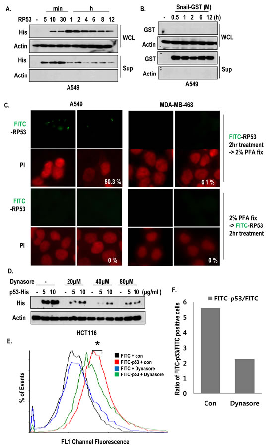 Figure 2: Active internalization of p53 core domain occurs by K-Ras dependent manner. (A-B) K-Ras dependent endocytosis was a p53-specific event. RP53 and recombinant Snail (Snail middle region; GST tag; 91-121 amino acids (AA)) were treated in a time-dependent manner for up to 12h in the K-Ras harboring A549 cells. The endocytosis levels were measured by western blot analysis using the indicated antibodies. (C) Internalization of RP53 was appeared through active mechanism. Cells were divided into two groups; one group was incubated with FITC-p53 first and then fixed with 2% PFA, while the other group was exposed to PFA before FITC-p53 treatment. Both groups were stained with PI (propidium iodide; Red) for nuclear staining. (D) Dynamin inhibitor remarkably reduced endocytosis of RP53 in HCT116 cells. After incubation with Dynasore (from 20 to 80 μM) for 3 h, cells were treated with FITC or FITC-p53 for 1 h as an indicated dose. After washing with PBS, cells were harvested and subjected to SDS-PAGE. Western blot analysis was performed with indicated antibodies. (E) Decreased internalization of RP53 in A549 was measured by FACS analysis. (F) Internalized RP53 was quantified by graph. Numbers of Y-axis showed the value of FITC-p53 positive portion/FITC positive portion. After incubation with Dynasore (80 μM) for 3 h, cells were treated with FITC or FITC-p53 (2 μg/ml) for 1 h.