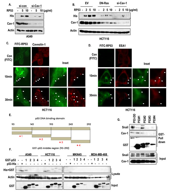 Figure 3: Caveolin-1-mediated endocytosis of p53 core domain. (A) A549 cells, which were transfected with siRNA-targeting caveolin-1, were treated with RP53 for 2 h in a dose-dependent manner. Western blot analysis was performed with the indicated antibodies. Actin was used as a loading control. (B) Blocking of Ras activity or complete knock-down of caveolin-1 suppressed the endocytosis of RP53. HCT116 cells which were transfected with DN-Ras (Dominant Negative) and siRNA-targeting caveolin-1 were treated with RP53 for 2 h in a dose-dependent manner. Western blot analysis was performed with the indicated antibodies. Actin was used as a loading control. (C) Internalized RP53 was co-localized with caveolin-1 in time-dependent manner. HCT116 was treated with FITC or FITC-p53 following indicated time. After MeOH fixation, cells were stained with caveiolin-1 antibody (Red) and analyzed by confocal microscopy. Green (FITC) indicated endocytosed RP53. Inset indicated enlarged figure of boxed region. (D) EEA1, an early endosome marker, was also co-localized with treated RP53 in time dependent manner. Immunofluorence (IF) staining was performed with the protocol above, and the images were obtained using confocal microscopy. Inset indicated enlarged figures of boxed region. (E) Determination of key region for endocytosis through fragment mapping. The p53 DNA-binding domain (93-292 AA) was cleaved into 4 small fragments with 50 AA each, which were then tagged with GST. (F) Among the fragments, p53 #1 (93-142 AA) was specifically internalized into K-Ras mutated cell lines (A549 and HCT116). 4 cancer cell lines were incubated with either RP53 or with the 4 different fragments of p53. After 2 h, cells were washed twice with PBS and analyzed by western blot using the indicated antibodies. Actin was used as a loading control. (G) p53 #1 directly interacted to caveoin-1. Agarose bead- conjugated GST-p53 (DNA binding Domain; 93-292AA) and p53 fragments (p53 #1-4) were incubated with A549 cell lysates. GST-pull down was performed to monitor p53-associated proteins.