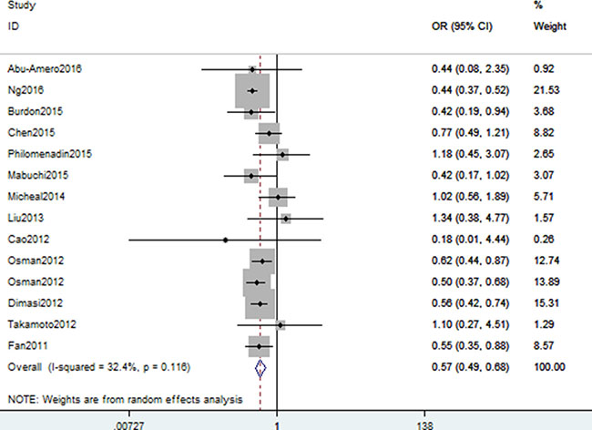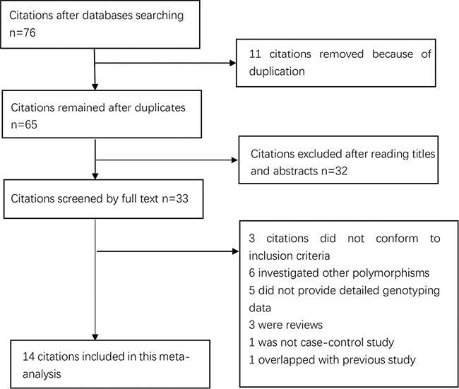 We yielded a total of 76 citations the by searches of the PubMed and Embase databases and manual searching. 43 citations were removed after removing duplicates and screening the titles and abstracts. 33 citations were selected for further full text review. 19 citations (3 citations did not conform to the inclusion criteria; 6 investigated other polymorphisms; 5 did not provide detailed genotyping data; 1 overlapped with previous study; 3 were reviews; and 1 was not case-control study) were excluded after serious review. 14 eligible studies [12–17, 19–26] (11,316 cases and 24,055 controls) in this meta-analysis finally. Selection for eligible studies included in this meta-analysis was presented in Figure 1. The characteristics of the individual studies included in the meta-analysis are summarized in Table 1. The Newcastle-Ottawa Scale (NOS) scores of all included studies ranged from 6 to 7 stars, suggesting that these studies were of high methodological quality.